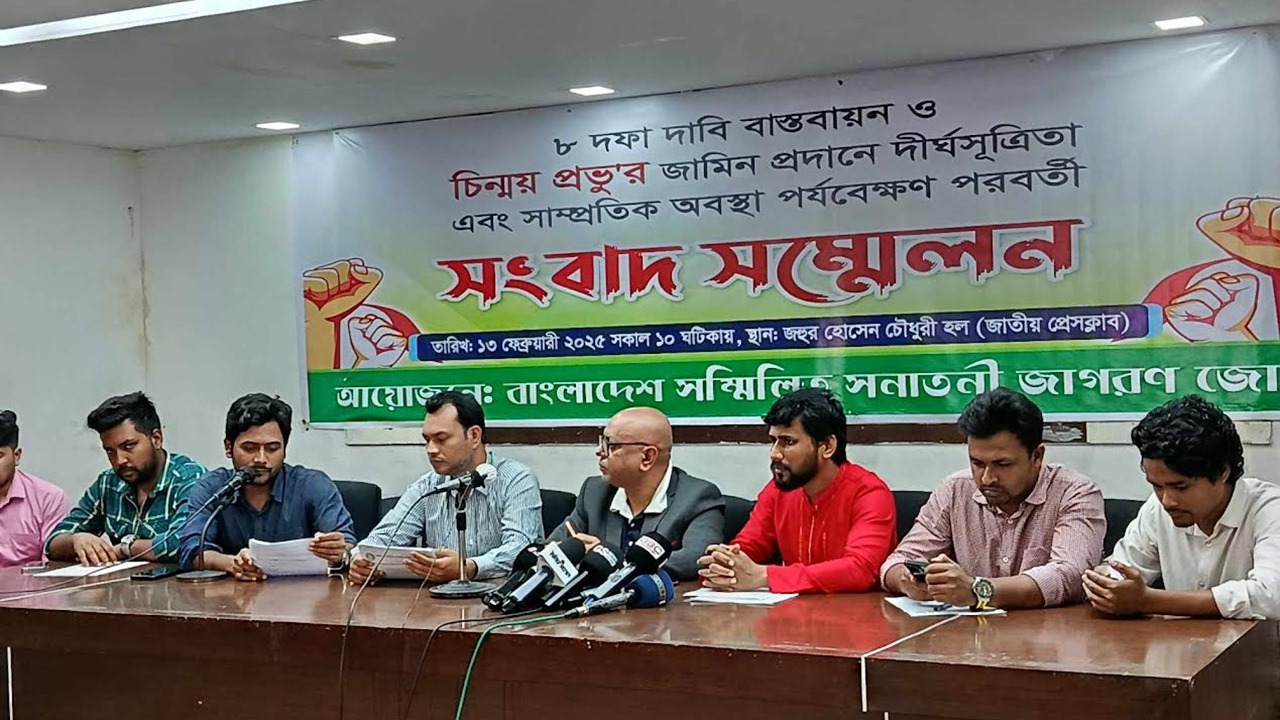 মুখপাত্র চিন্ময় কৃষ্ণ দাসের মুক্তিসহ মোট ৮ দফা দাবি জানিয়েছে বাংলাদেশ সম্মিলিত সনাতনী জাগরণ জোট। বৃহস্পতিবার (১৩ ফেব্রুয়ারি) জাতীয় প্রেসক্লাবে