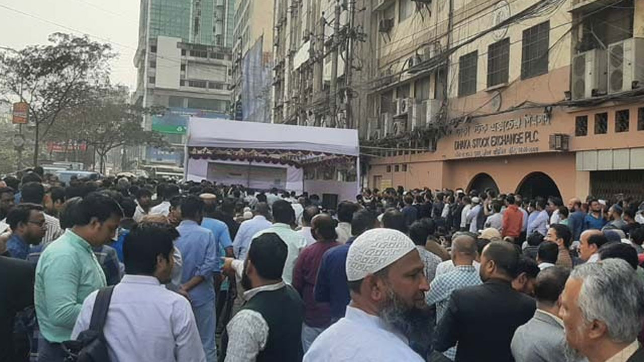 ১১ দাবি নিয়ে মতিঝিলে শেয়ারবাজারে বিনিয়োগকারীদের সমাবেশ